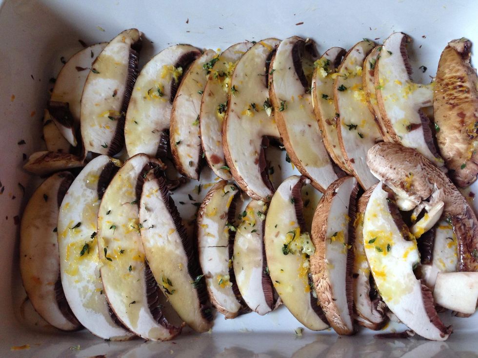 Slice the mushrooms and place them in a single layer on a baking dish.