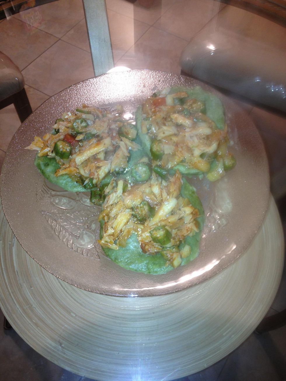 Add oil to the Pan and then add in your onions then stir. Then add in your okra and selfish and stir around.