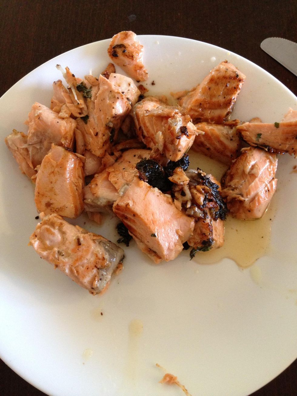 Put some olive oil in the pan. Put salmon WITH all the marination. Chop into small pieces if want for easier cooking.