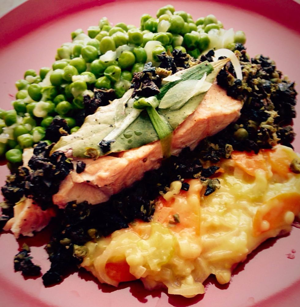 Place the salmon fillet at the center, peas on one side and vegetables vinaigrette on the other, and sprinkle capers and olives on top of the fillet. Enjoy!