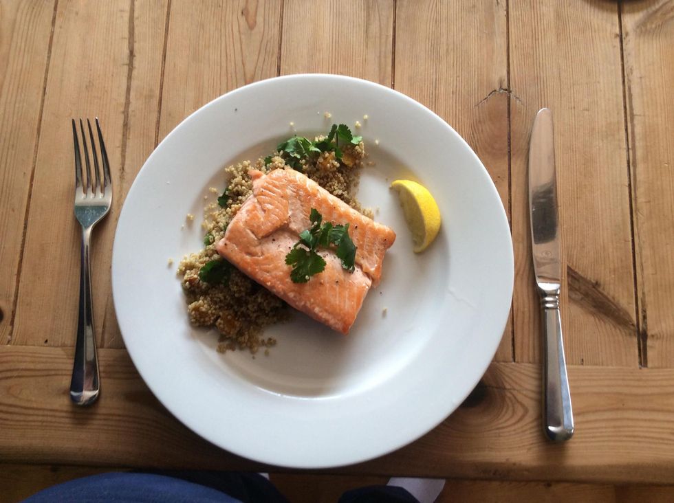 To plate up, place three tablespoons of salad across the plate, add the salmon on the top, as shown in the photograph. Season with salt and cracked black pepper, and garnish with a lime and coriander.