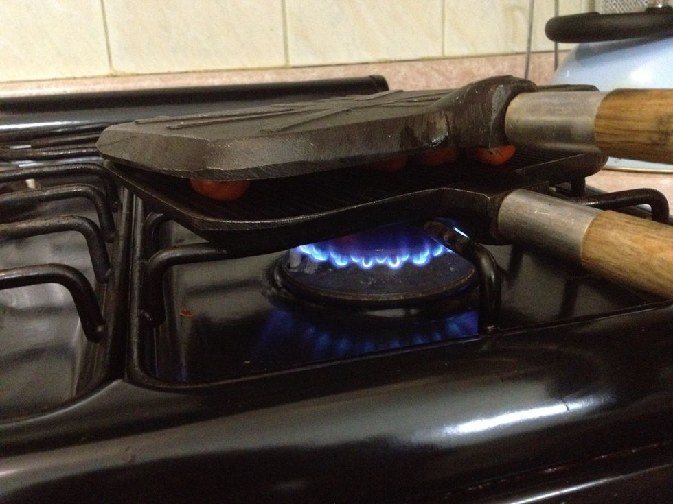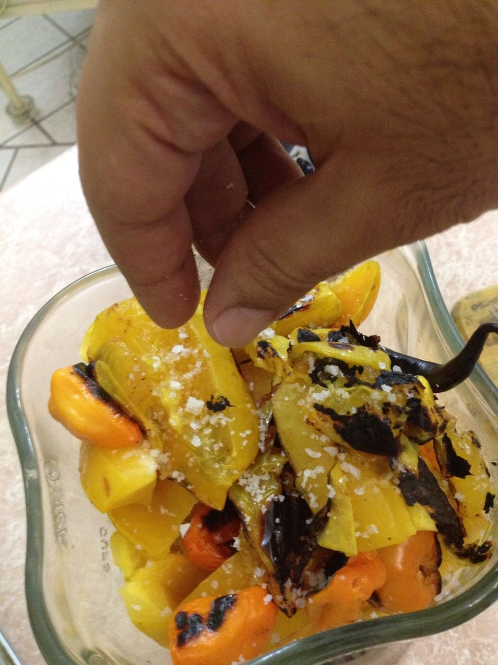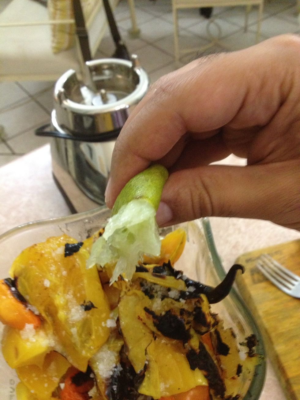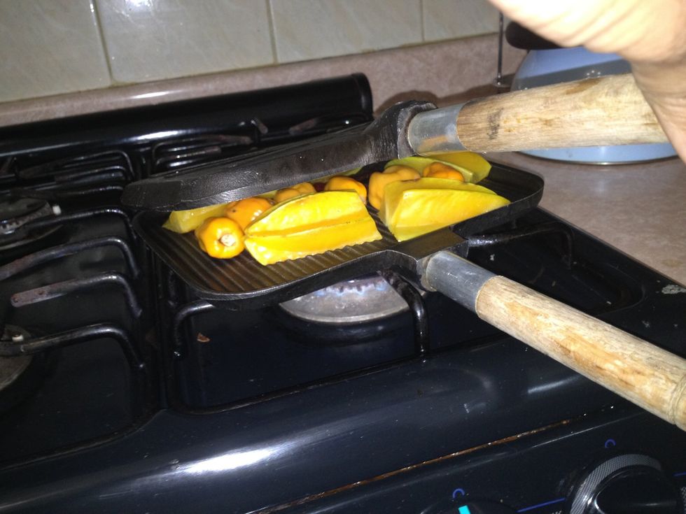 Cuando los carambolos y chiles esten asados voltearlos para asar la otra parte.