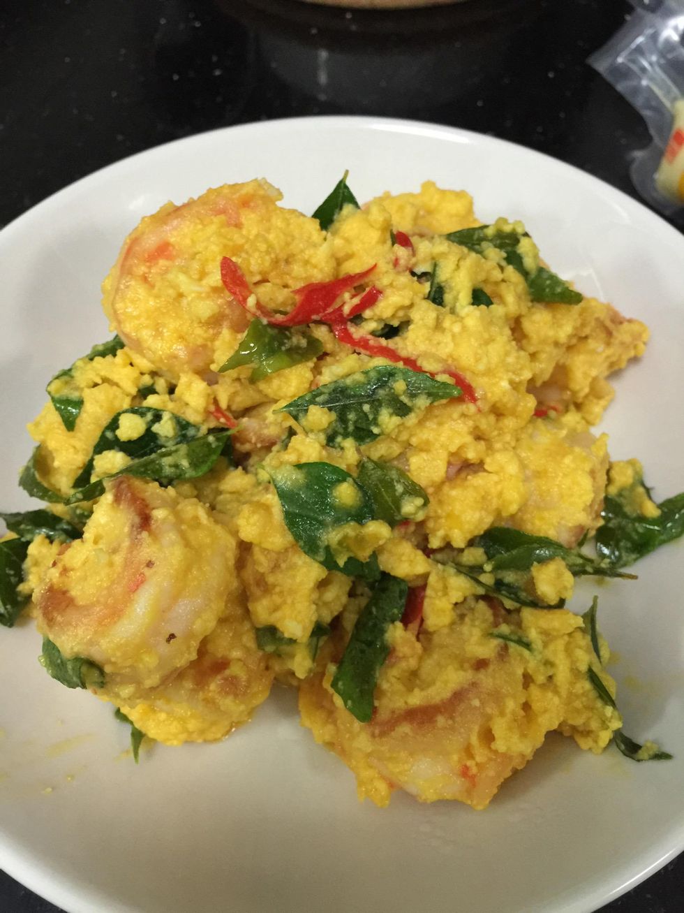 Make sure the prawns are nicely coated with the salted egg yolk.
