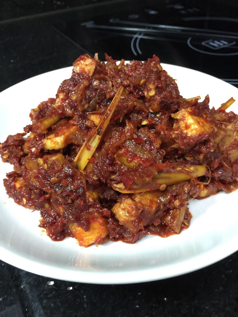 Add chopped lemon grass and keep frying in medium heat until fragrance. Make sure keep stirring with your spatula as you do not want to burn the chillies.