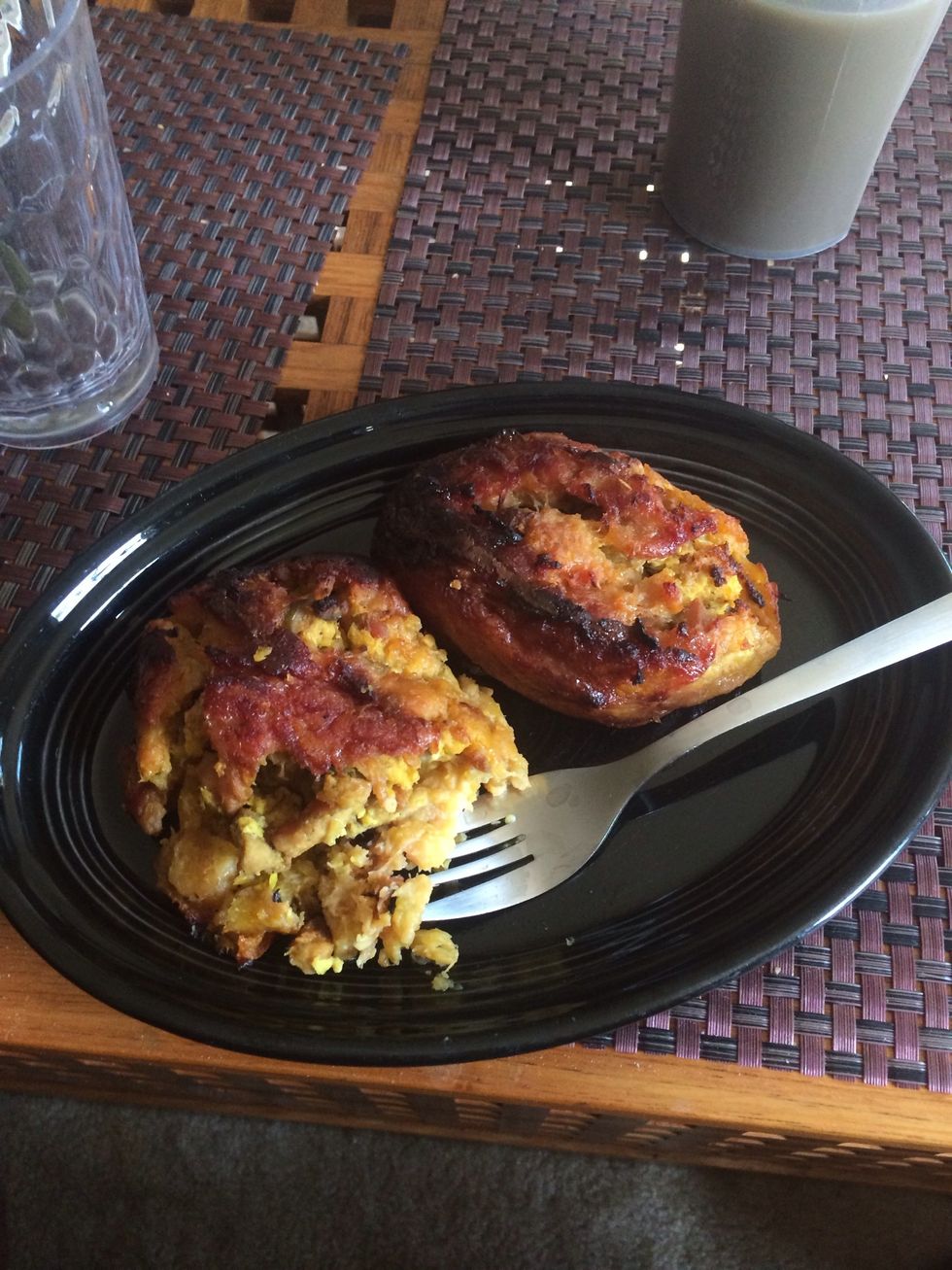 Make patty of plantain mash and place small amount of chicken mixture in it. Cover with more plantain mash ...work into a ball. Place in greased baking sheet or pan.