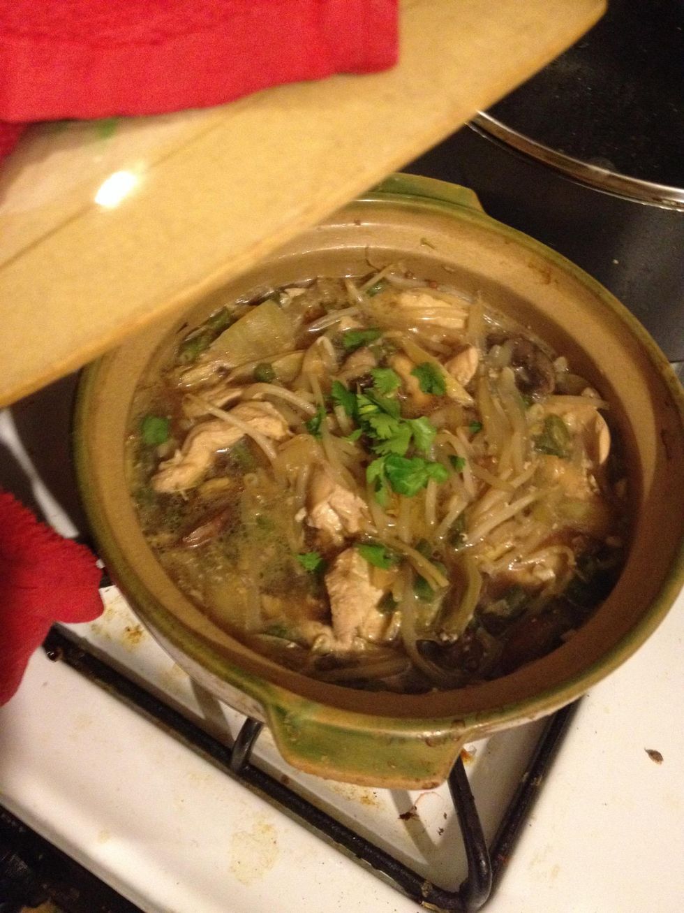 First use medium heat with sesame oil, fried garlic, ginger, and chili spice for a minute.