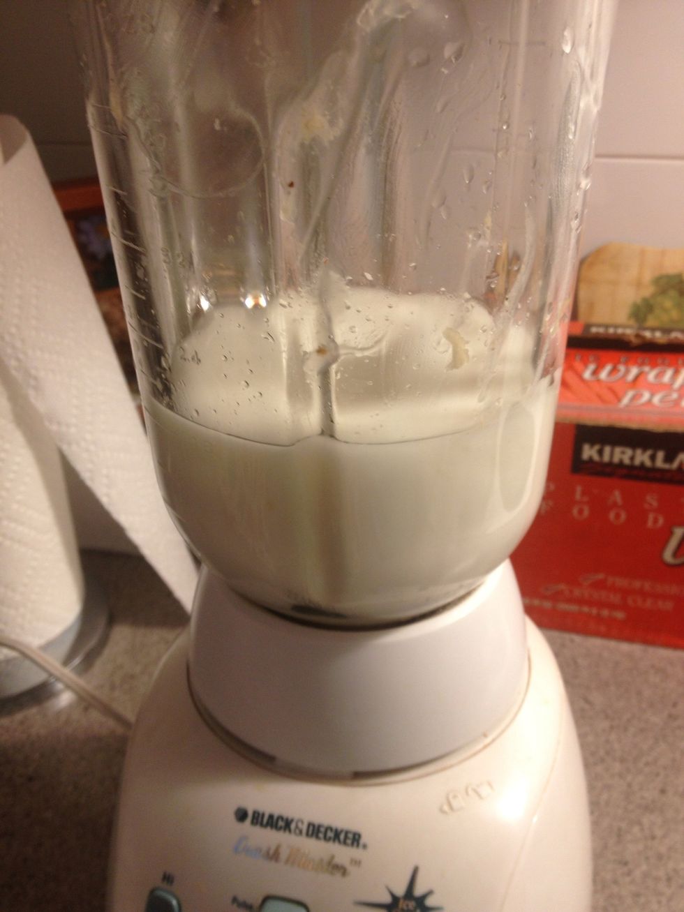 After it cool down put it on the mixer add garlic , oil , Lemon juice , and salt and turn on should looks like the next pic