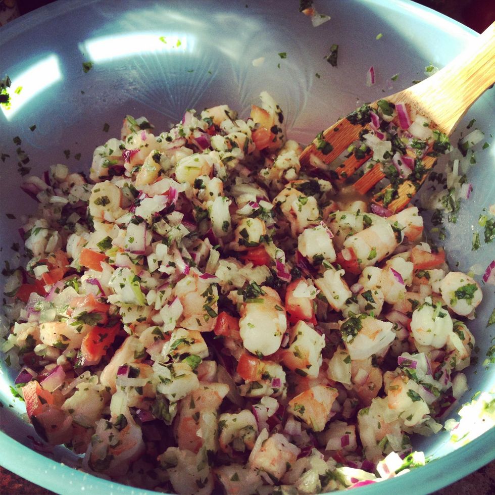 Peel and devein your shrimp, chop and add to the bowl! Let the mix marinate in the lime/lemon oil/vinegar overnight for a delicious chilled ceviche! Eat with tortilla chips, preferably home made!