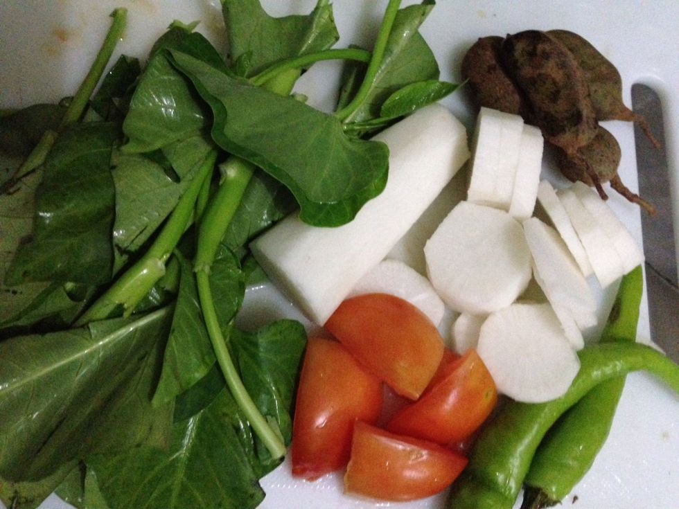 Chop radish,tomatoes and kangkong. Set aside.