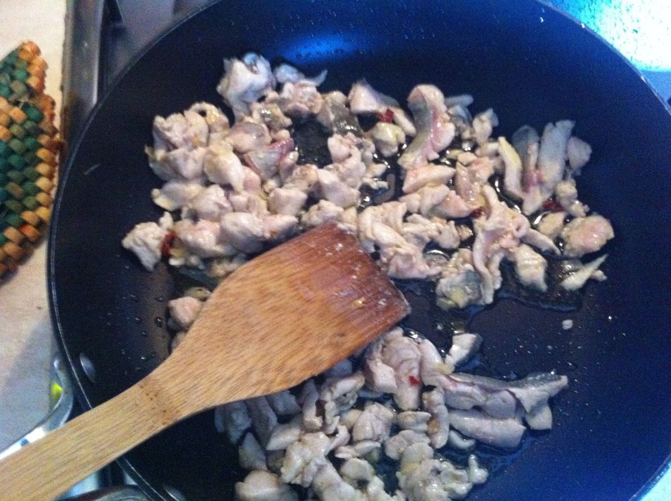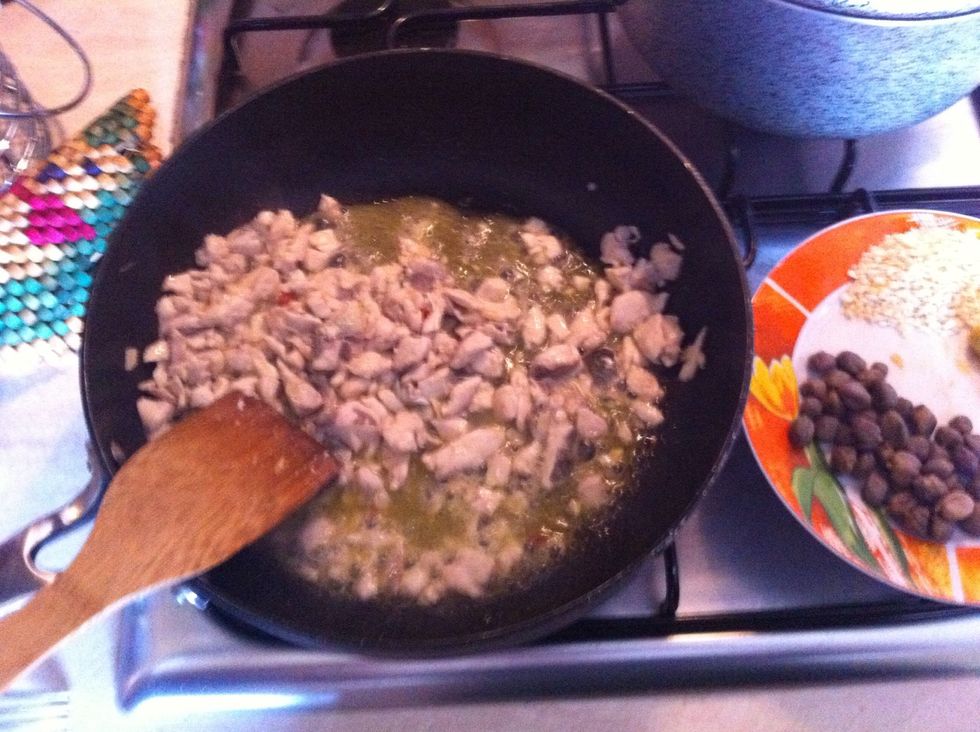 Start browning the chopped garlic with a little bit of chili pepper in olive oil until golden.