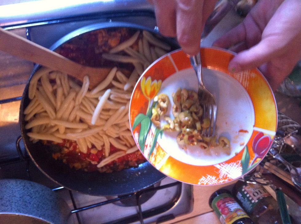 Add pasta to the fish sauce along with sliced green olives and cook until the sauce thickens.