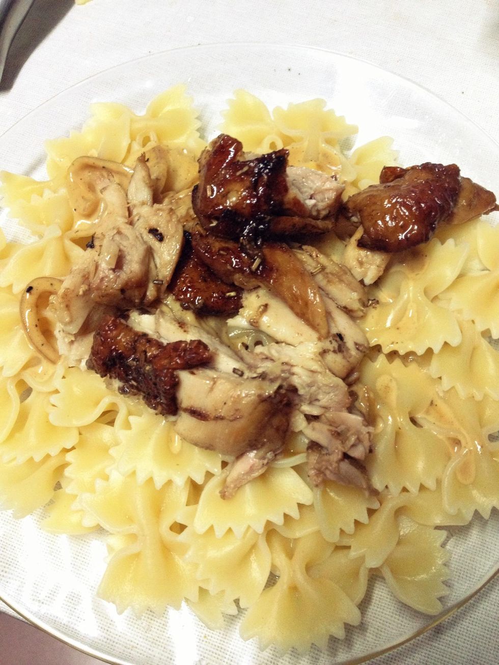 Drain the pasta and pour some of the Alfredo sauce on top and top it off with the chicken. Enjoy! :)