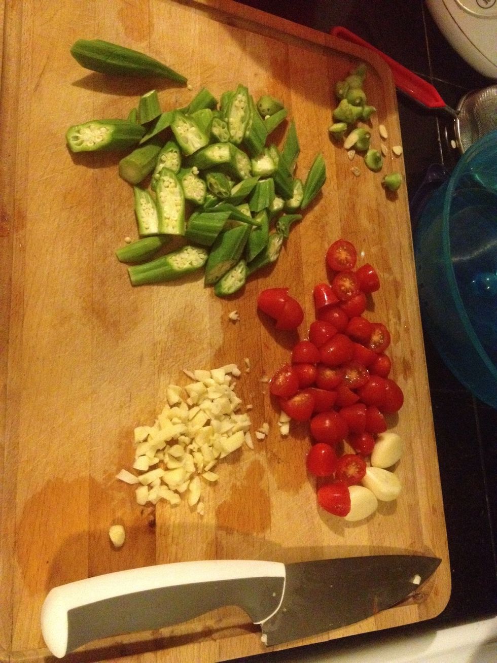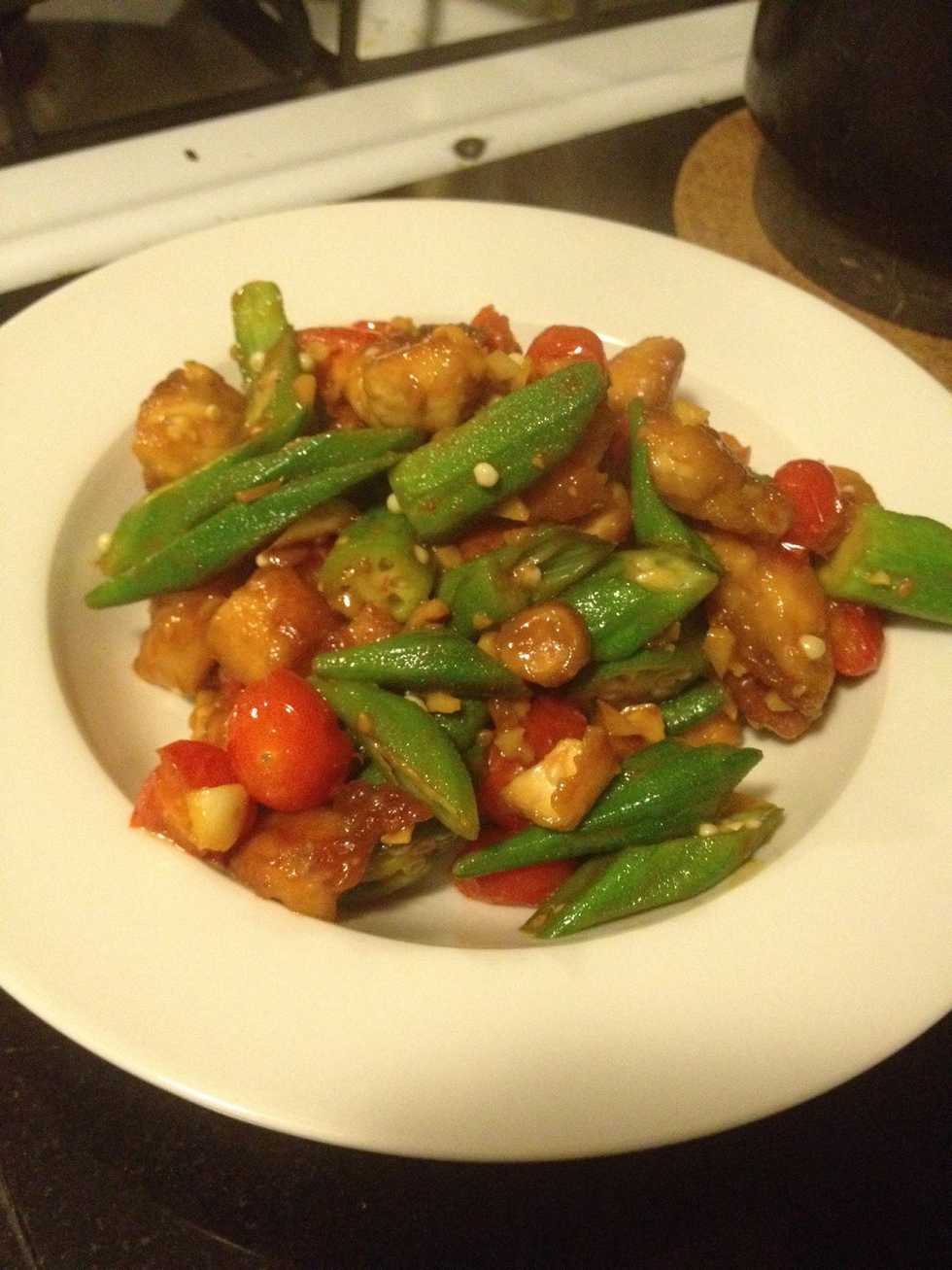 Add okra after and steam with cover for 2 minutes. Add soy sauce, salt and sugar.