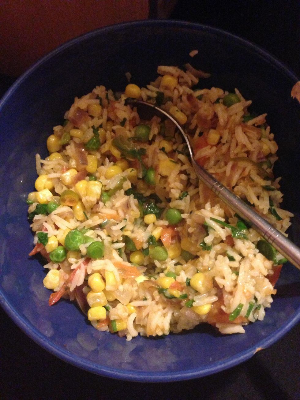 Add peas and sweetcorn and lower the heat. Cook until soft.