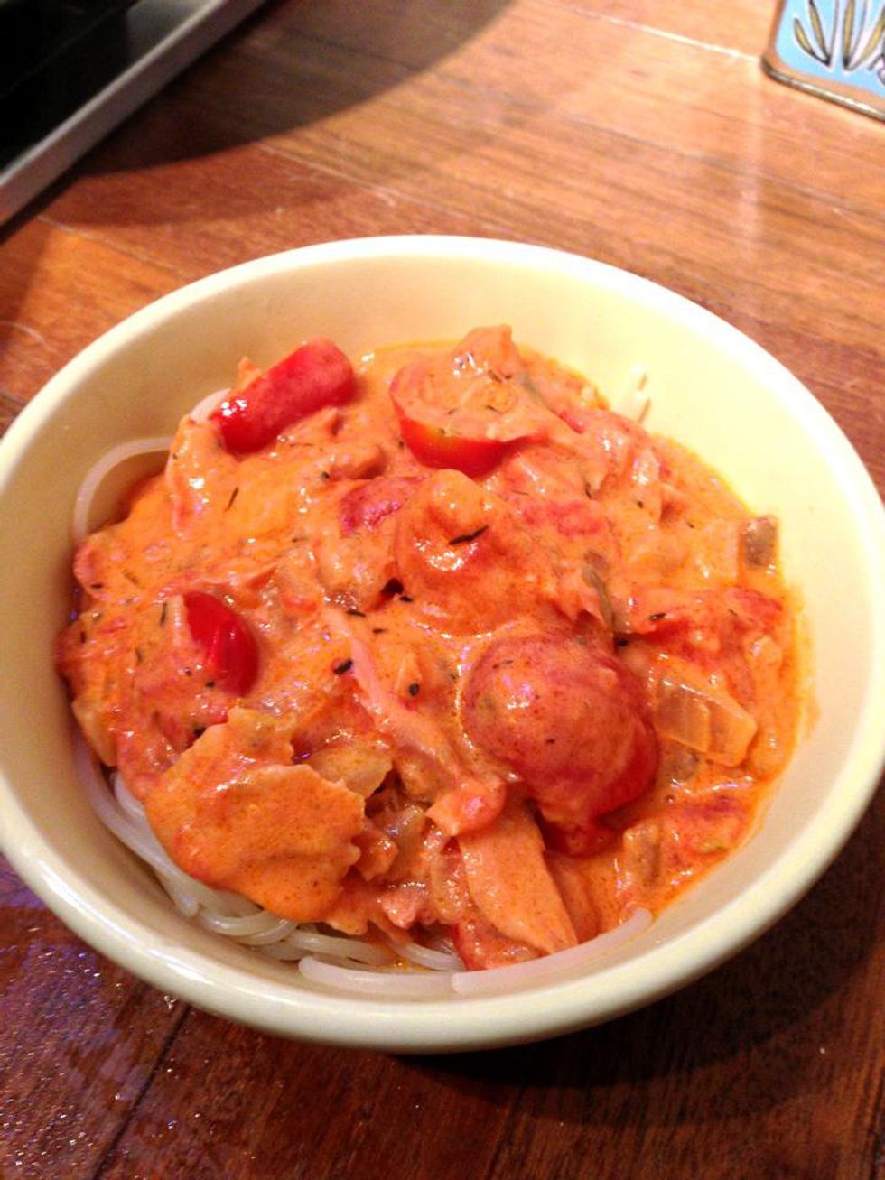 Add the cream & continue to simmer for 3mins. Thicken the sauce with flour & milk mix. As a final step, add the smoked salmon. Stir lightly and slowly so the fish don't break.