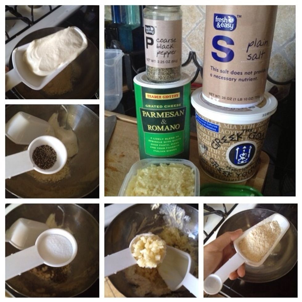 Combine Greek yogurt, Parmesan cheese, Garlic powder, Season salt, and pepper in a bow.