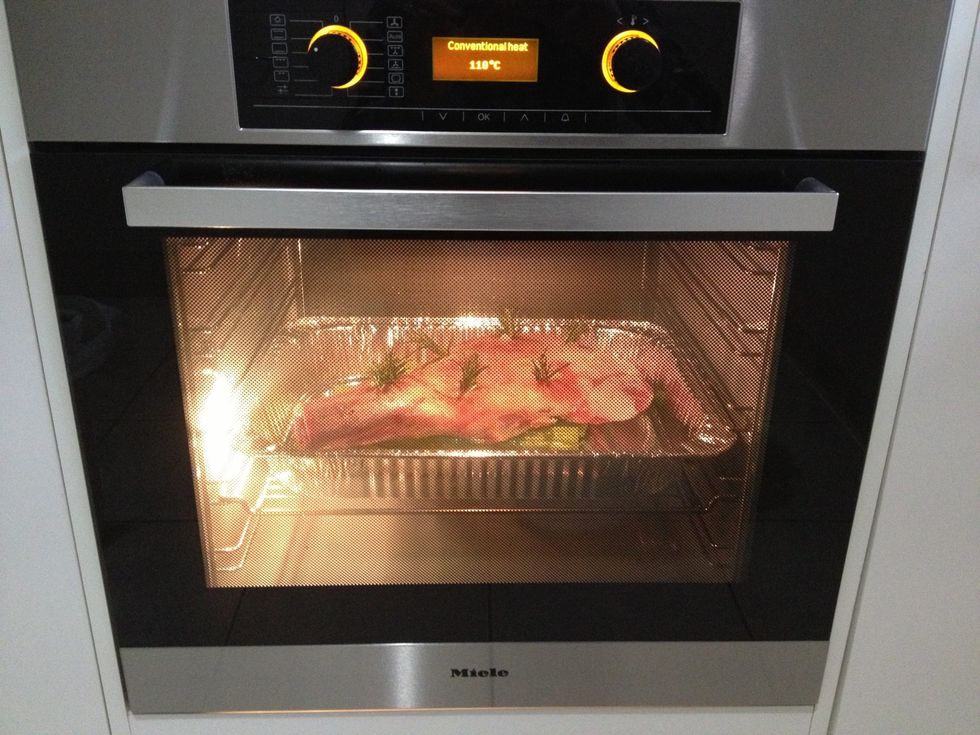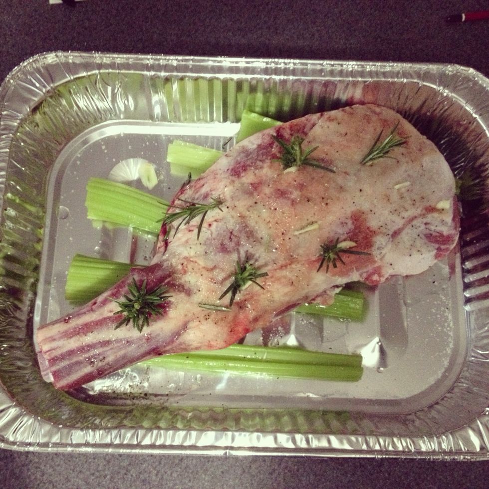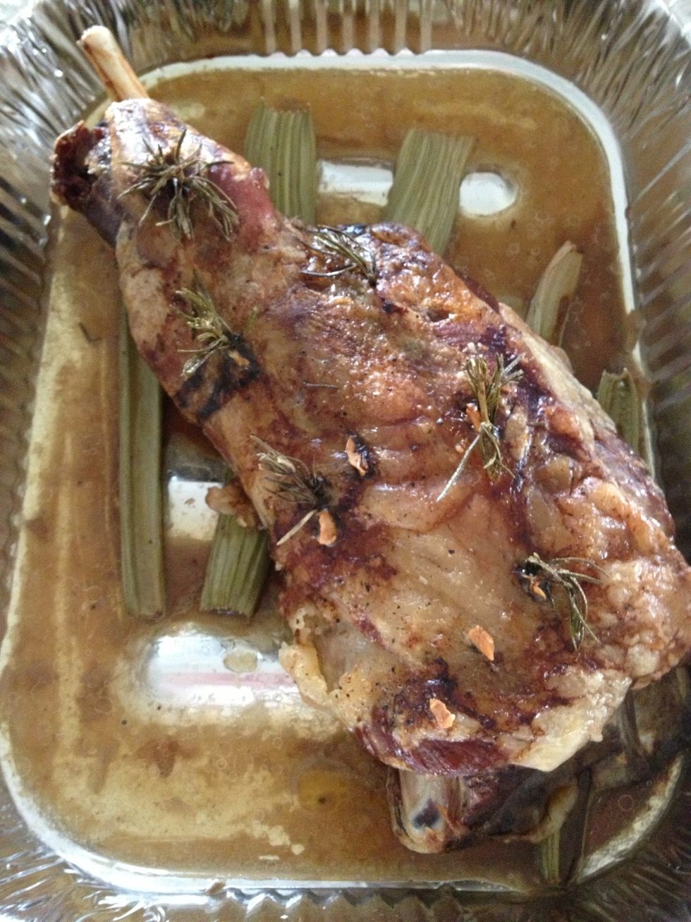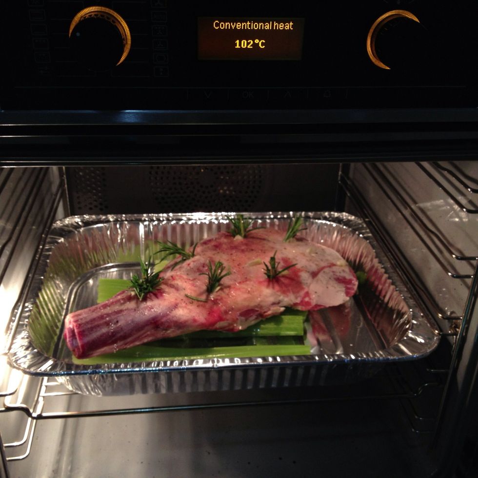 Cook in a 110 degree Celsius oven for 10 hours slow cooking. I put a cup of water in the bottom of pan so the meat stays tender. I also elevate the meat on some off cuts of celery .