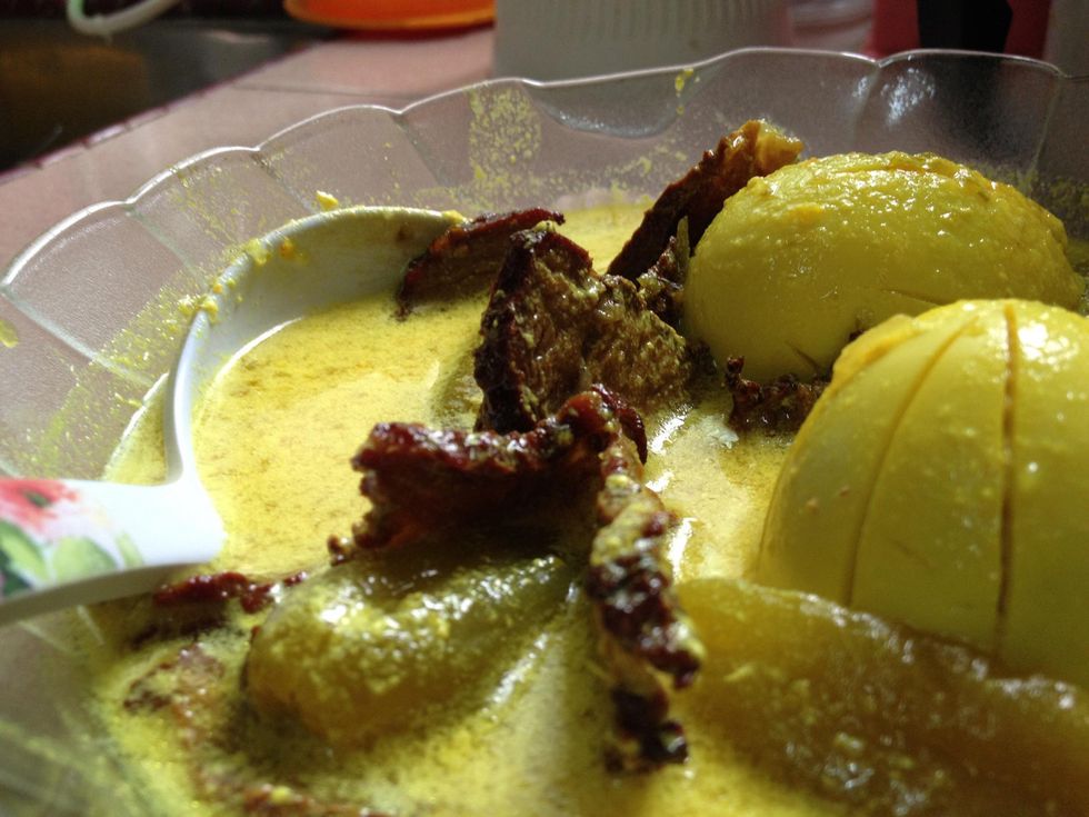Add the coconut milk/cream and stir well. Simmer another 3-5mins at low fire. Close fire when gentle bubbles appear.
