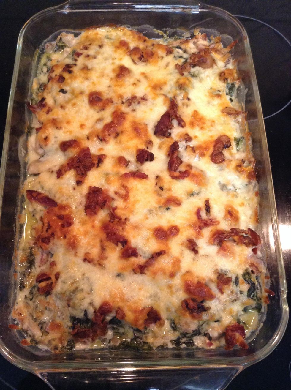Place cooked chicken breast into a 9x13 baking pan, top with the Spinach & Mushroom cream sauce.