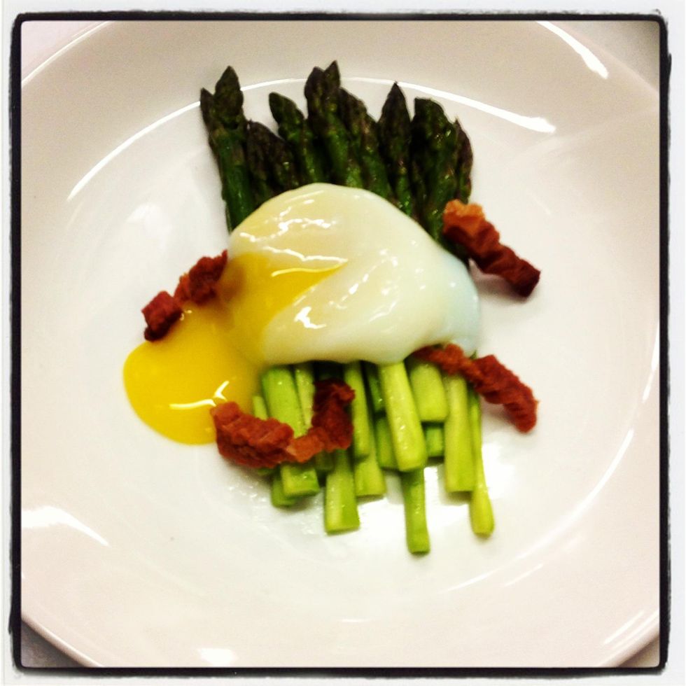 Once your eggs are done, carefully remove from bath and increase temp to 160F. Then add sealed Asparagus.