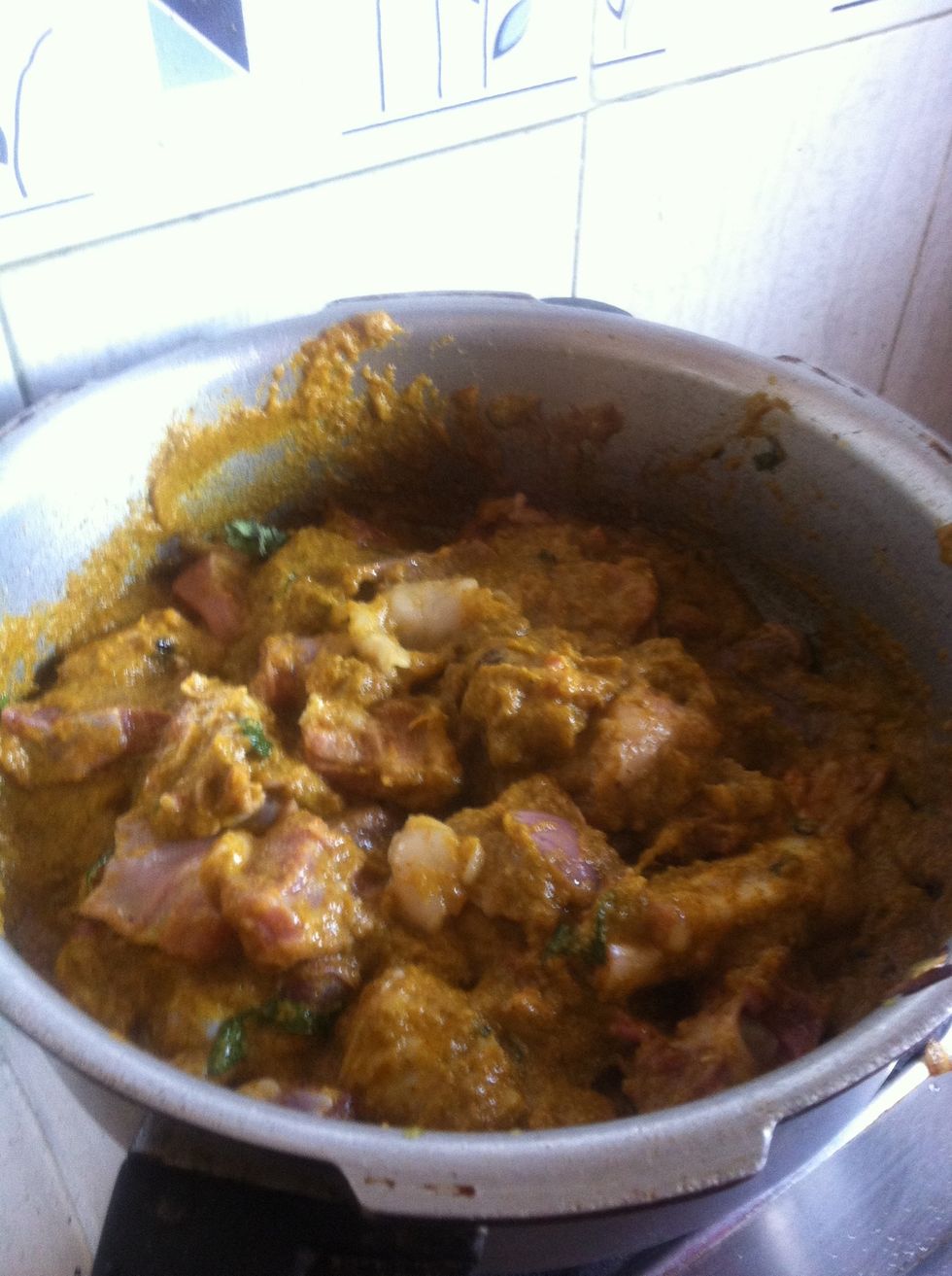 Cover the lid let it pressure cook for sometime...3-4 whistles should do the job of making the mutton tender
