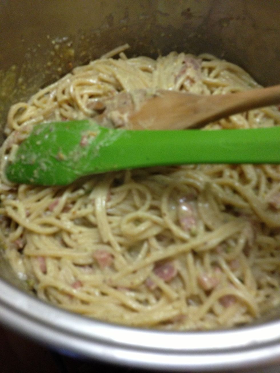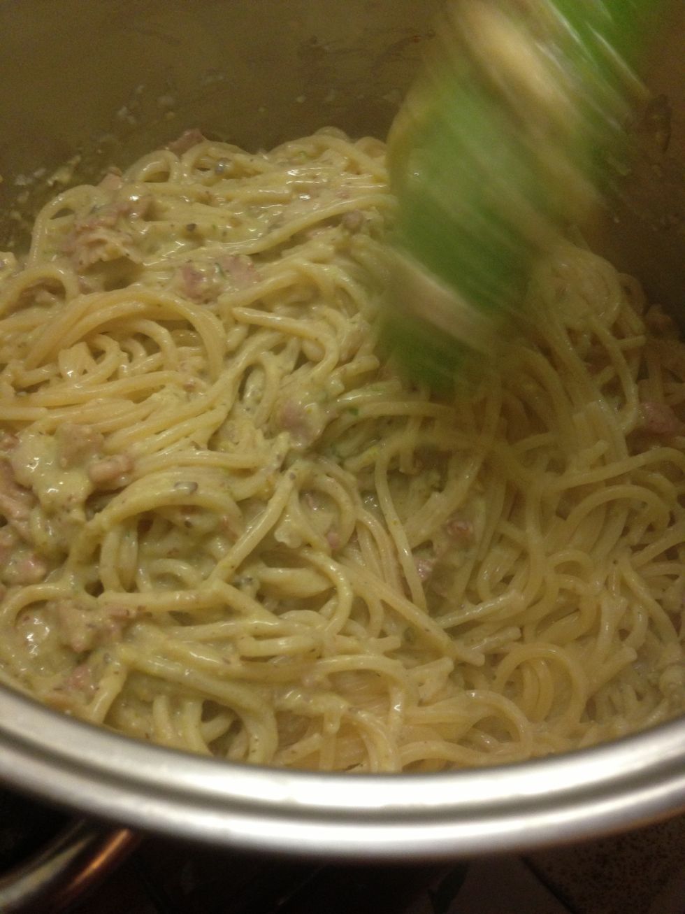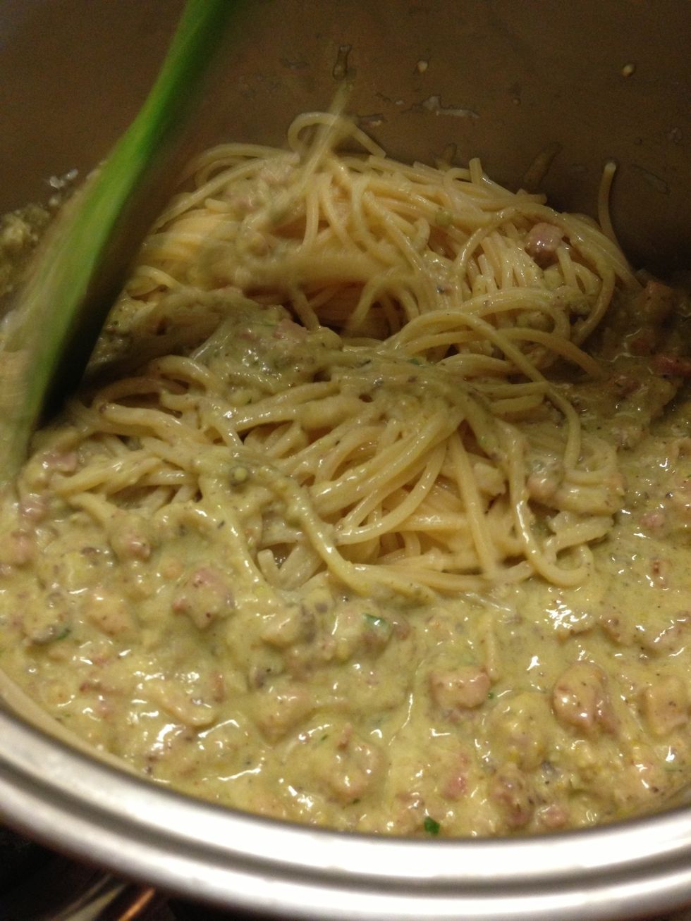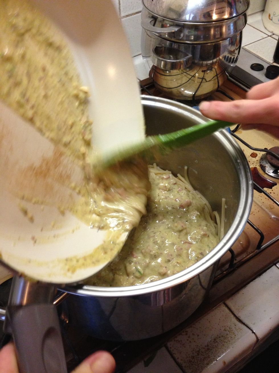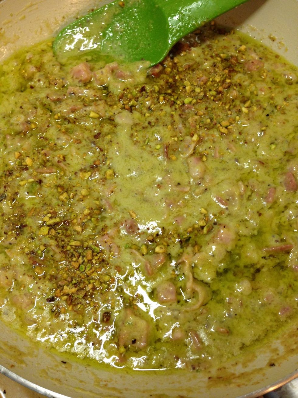 Aggiungere alla pancetta e al bacon il pesto di pistacchio (da vasetto) e il latte (2 bicchieri) in padella