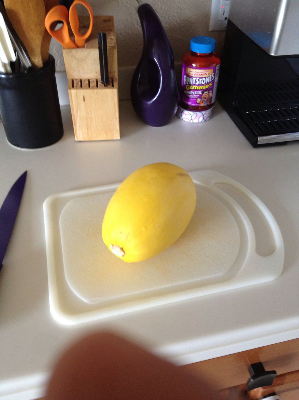 Cut in half. I put a towel down under the squash. It's tuff to cut, so be careful.