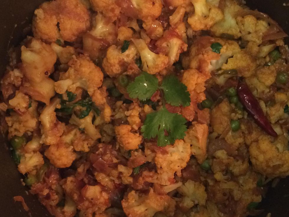 As the cauliflower cooks add cilantro and salt. Keep cooking on low heat. Cook uncovered and allow the vegetable mixture to blacken a bit. Serve with some mango pickle and wheat tortillas.