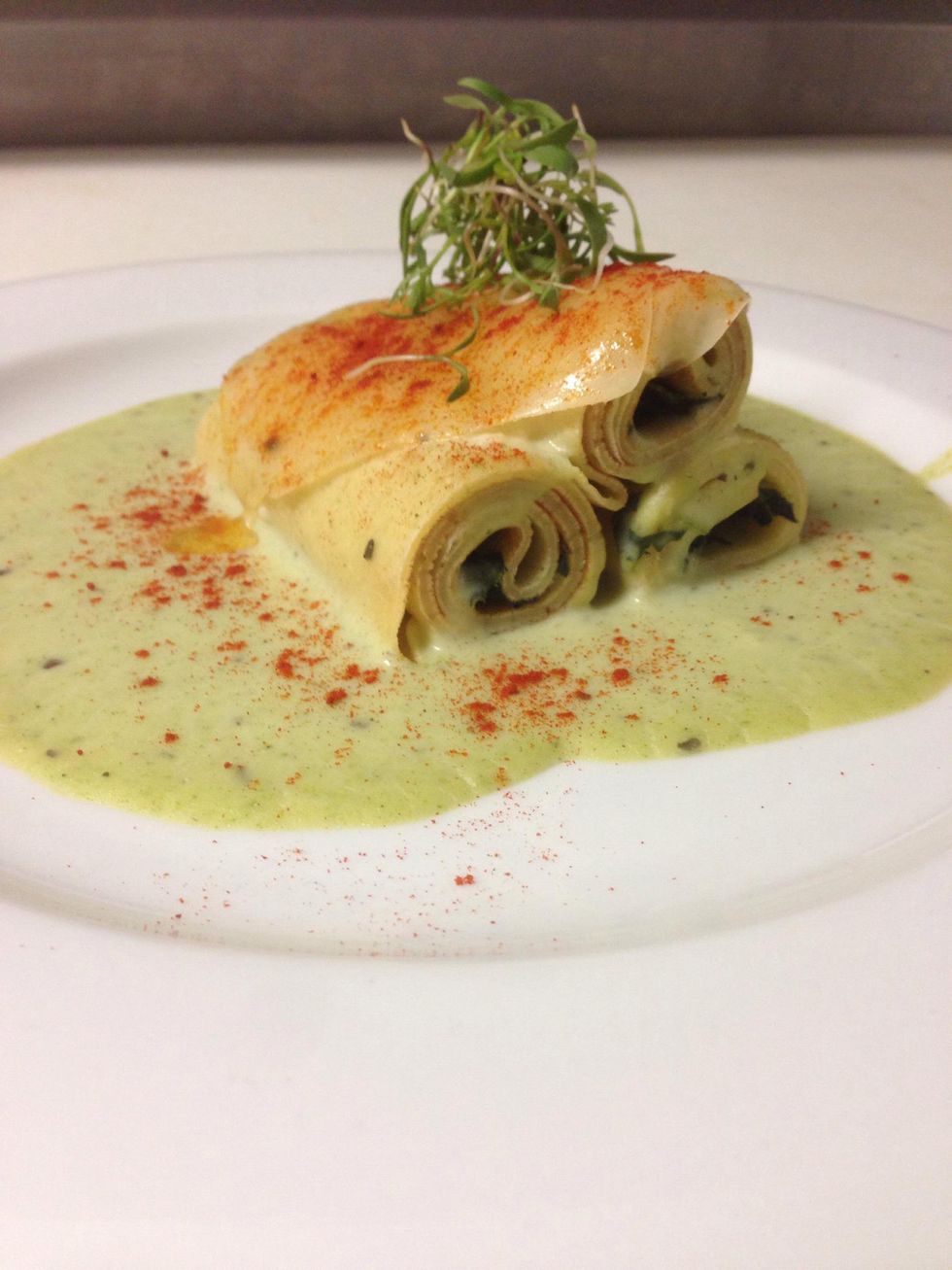 Role up the crepe whit the spinach and cut it in 3 like in the picture