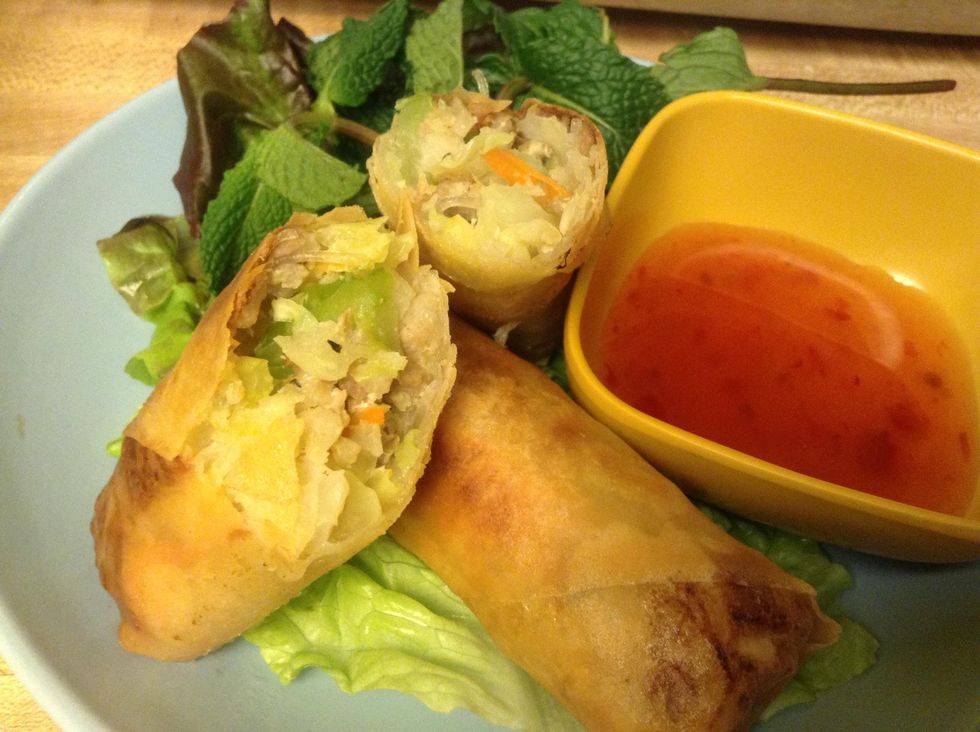 25.0 Spring roll pastry1.0lb Hot sausage or ground pork1.0 Clear noodle1/4lb Cabbage1.0c Carrot1.0c Daikon1.0c Celery1.0 Egg1.0Tbsp Fish sauce1.0Tbsp Vinegar1.0c Sweet chilli sauce for chicken1/2tsp Pepper1/2Tbsp Salt3.0c Vegetable oil