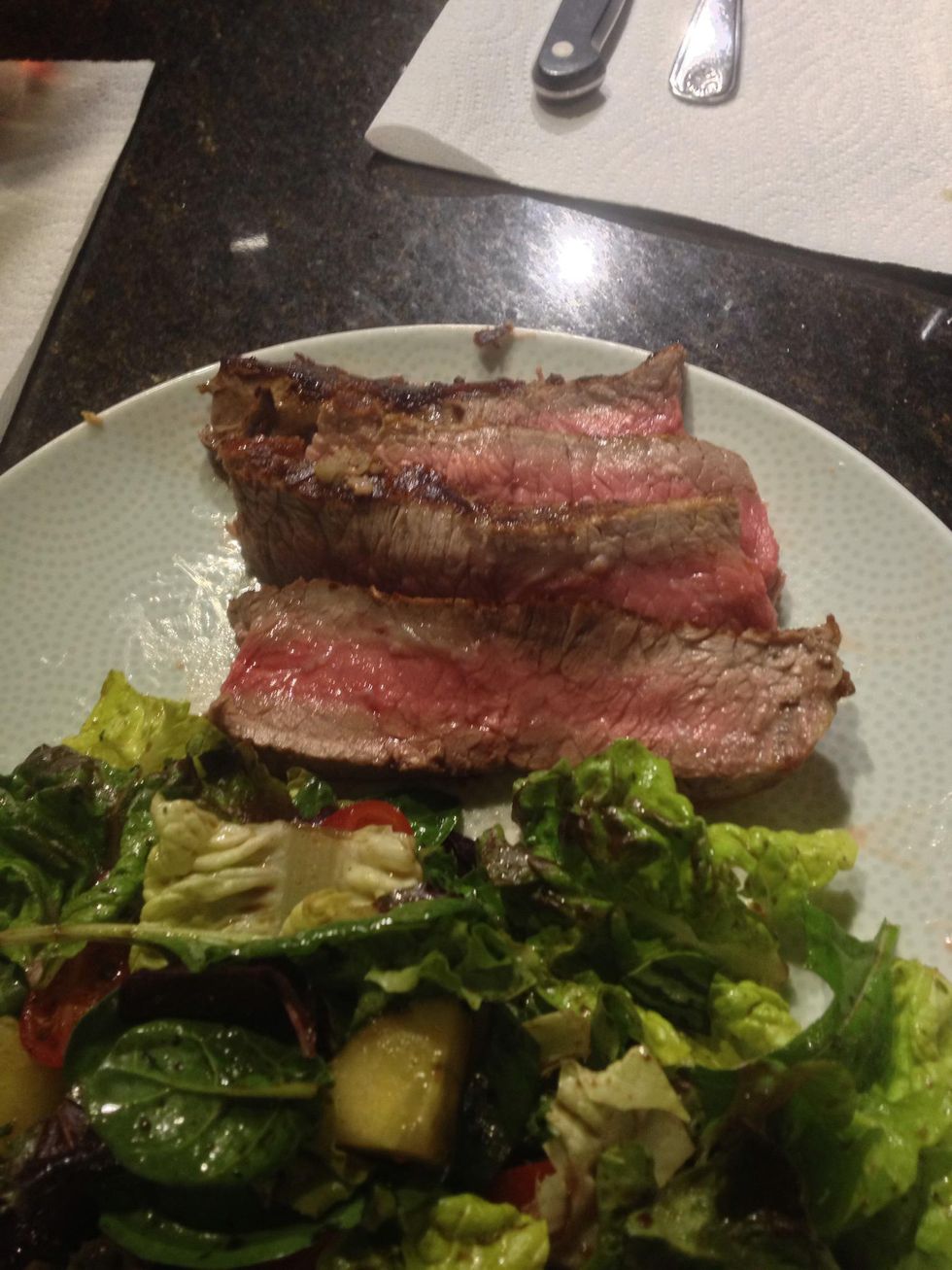 Center steak in pan cook for 4 to 6 min on stove. Immediately pre-heat broiler do not turn the meat. Space rack with 2" to 3 " clearance broil 7 to 9 minutes. The broiler cooks the topside.