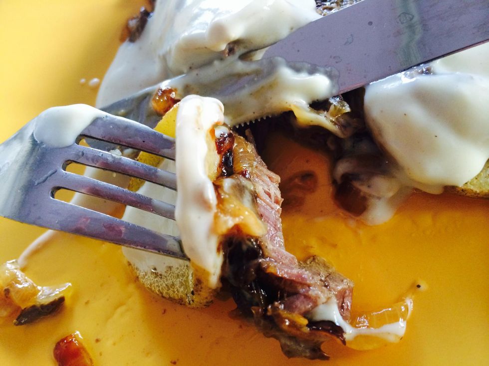 Steak. Onions. Potato and the fungi sauce and enjoy !!!! 😁😁