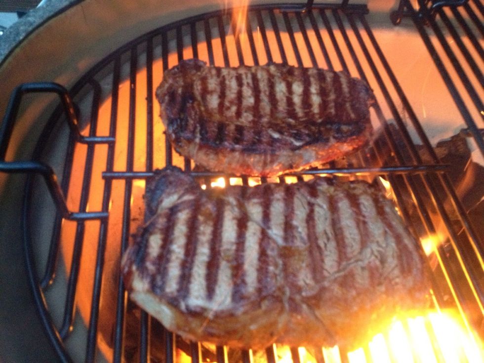 Place the steaks directly above the fire. Do not be afraid of the flames. The secret to ceramic grills is it cooks in an air tight environment. Close the top and cook on each side for 3 min each.
