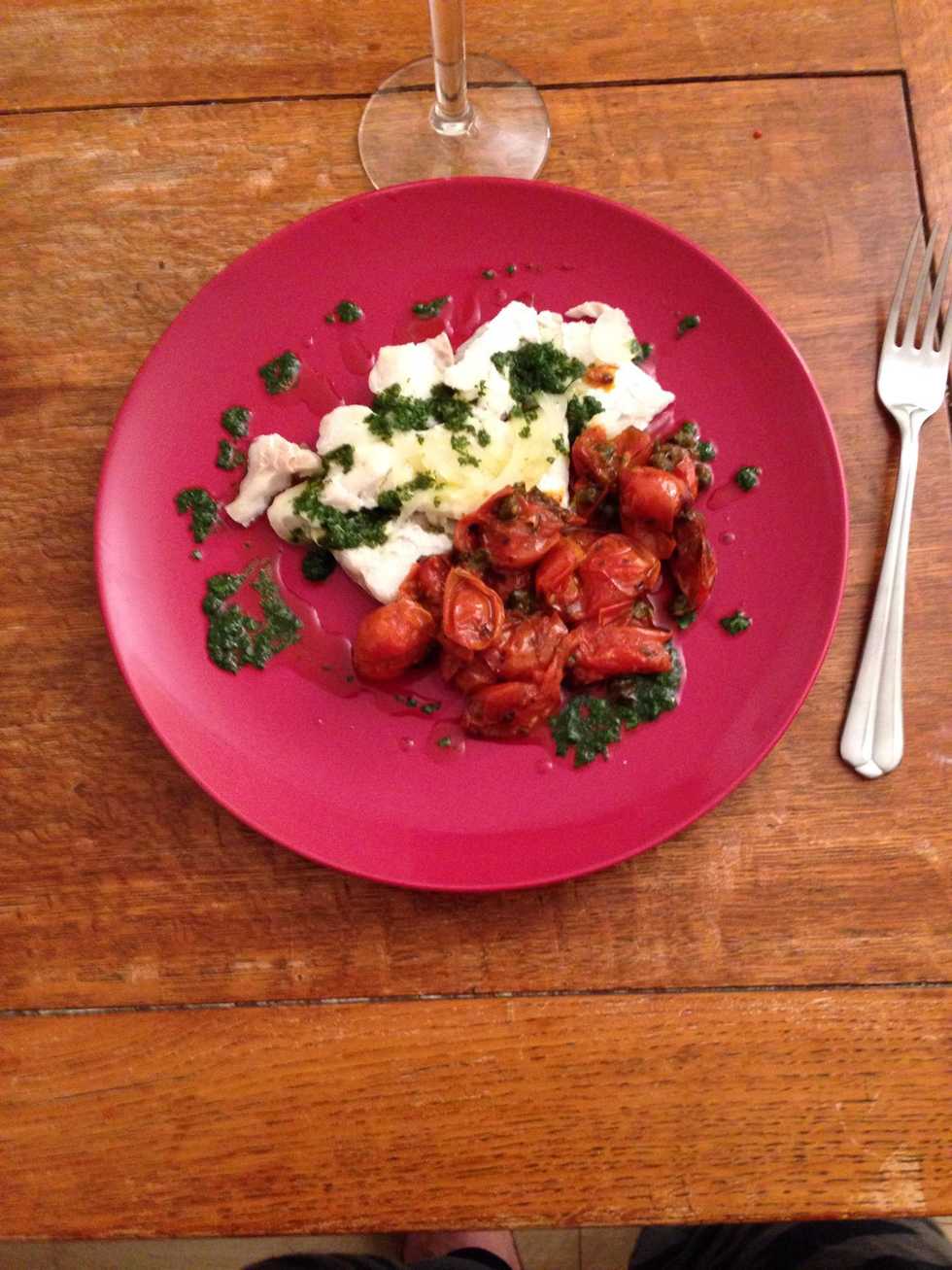 Once also the fish is cooked, you can start by plating it, garnishing it with the green sauce and then adding the tomatoes on the side.