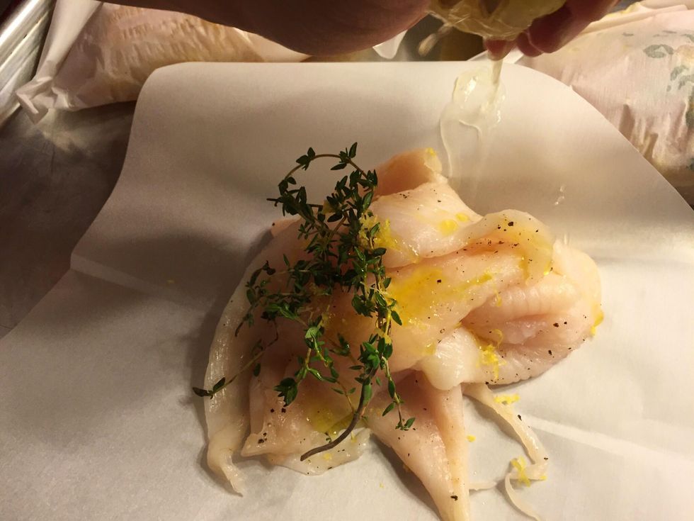 Then add some fresh lemon juice to the fish. Seal the pouch of fish and cook in the oven at 375 degrees. Cook for 15-20 minutes.