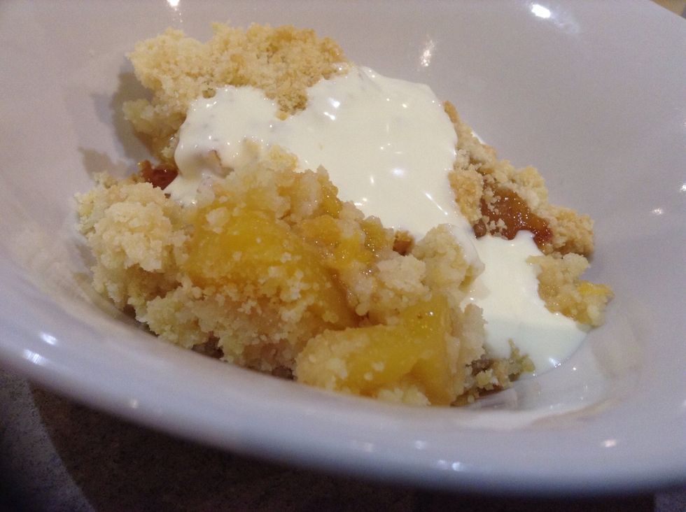 While fruit is softening make a crumble mixture by rubbing plain flour with the butter, sugar and salt