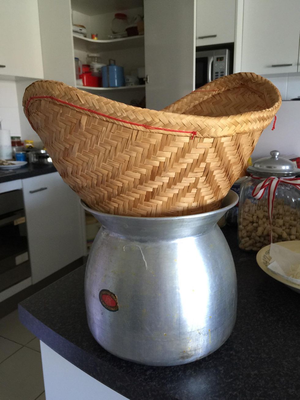 This is the old school steamer that you would normally used. You fill the bottom with water, rice in the basket. Boil and let the steam flow up to cook through the rice.