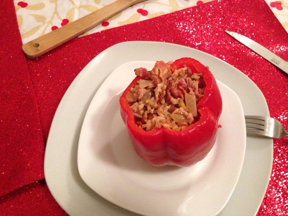 Fill the peppers with the mixture, do them a bit full so the mixture piles higher than the peppers walls. Nothing is prettier than beef and bacon mixed together on a shimmery placemat.