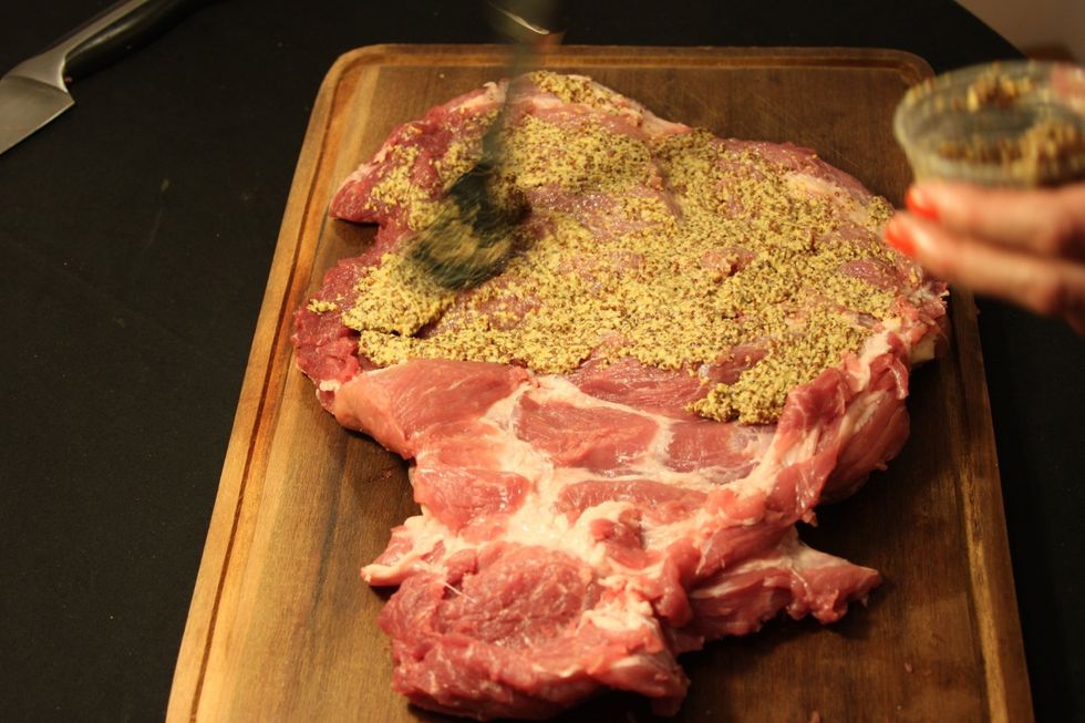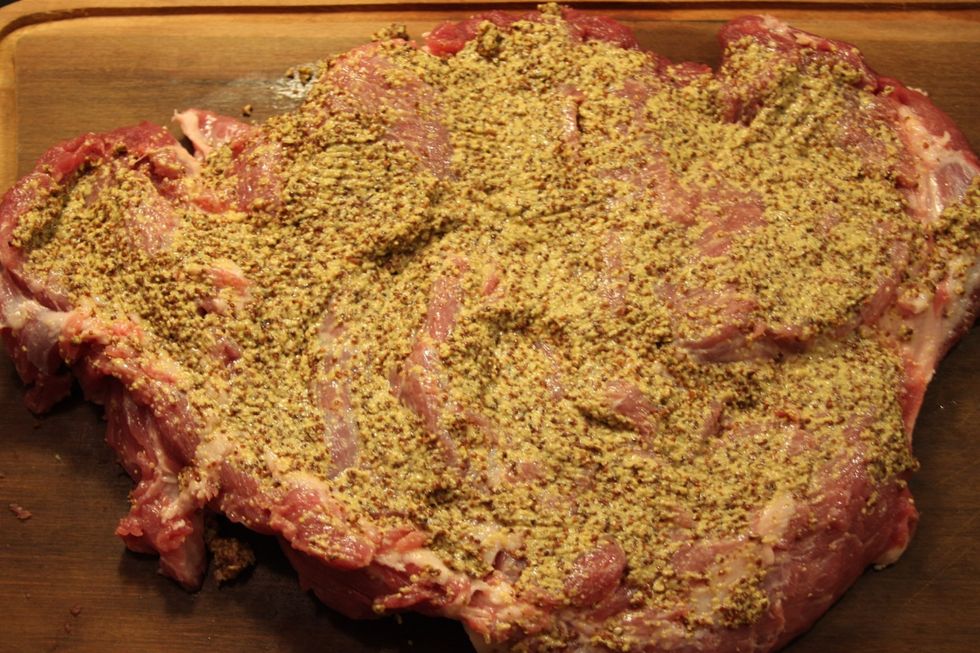 Salgar a carne a gosto. Logo, espalhe a mostarda de dijon à antiga sobre a superficie.