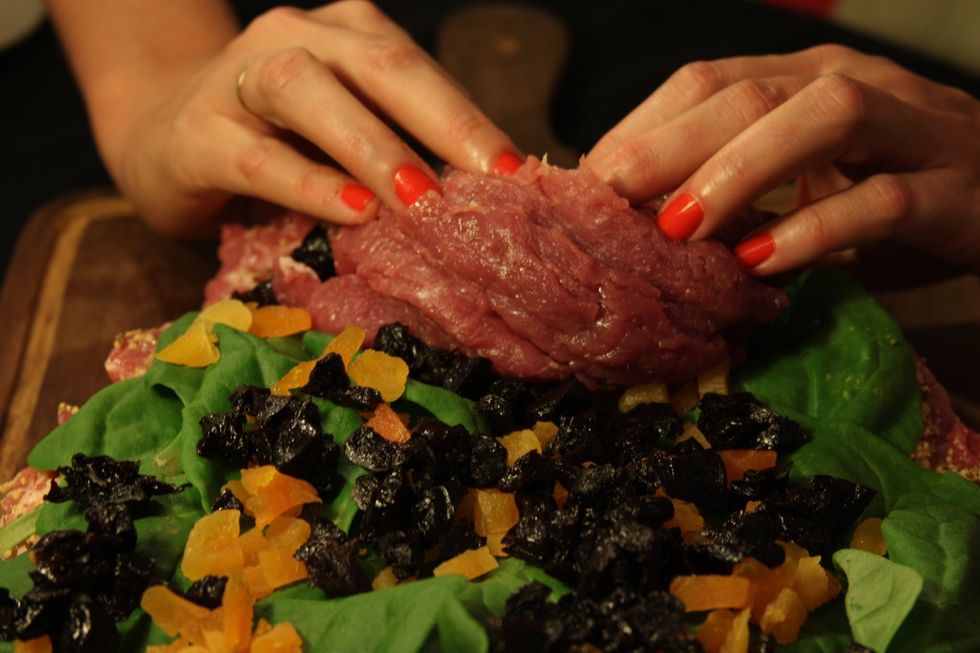Enrole a carne e segure com a mão