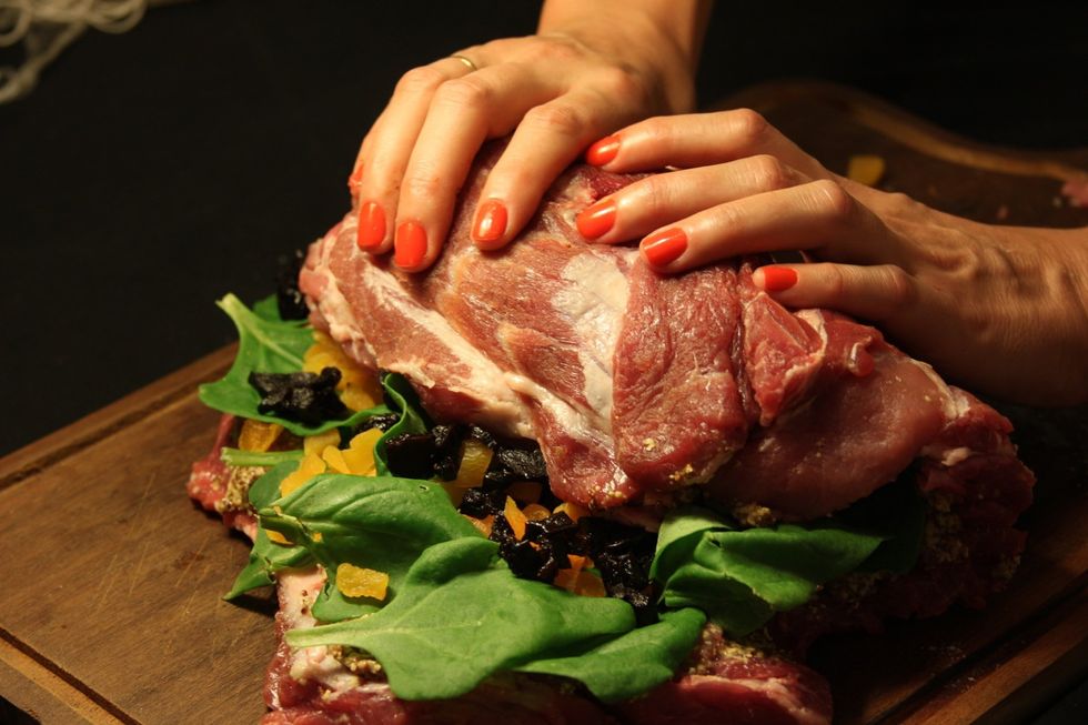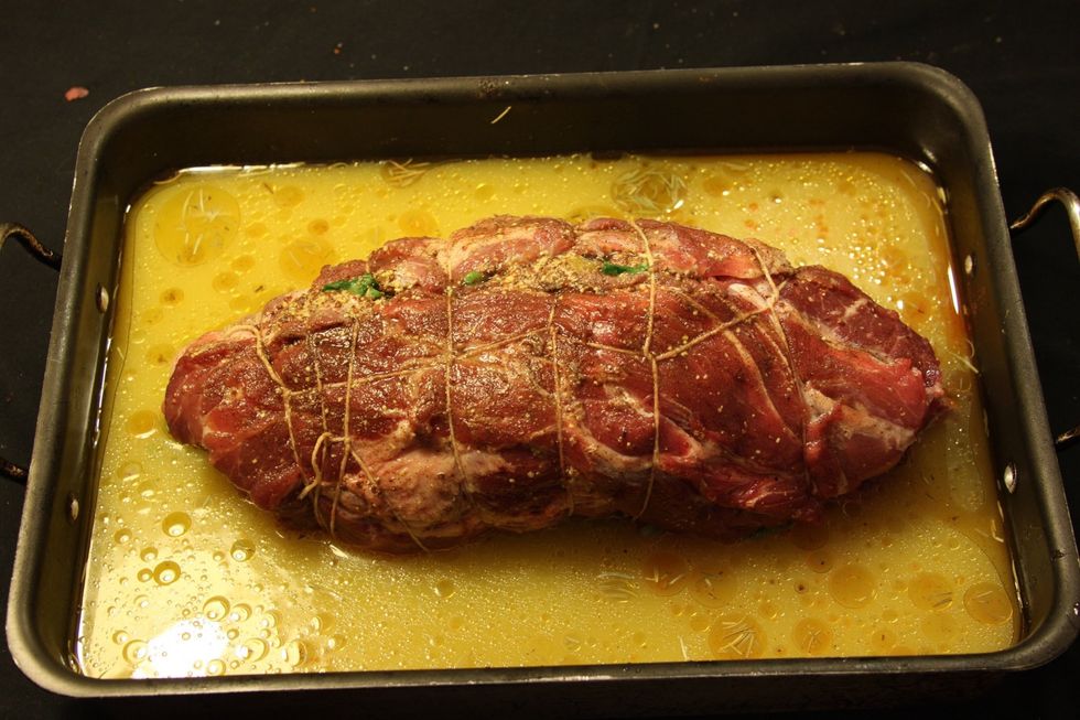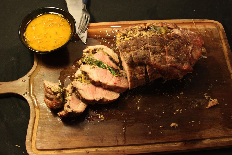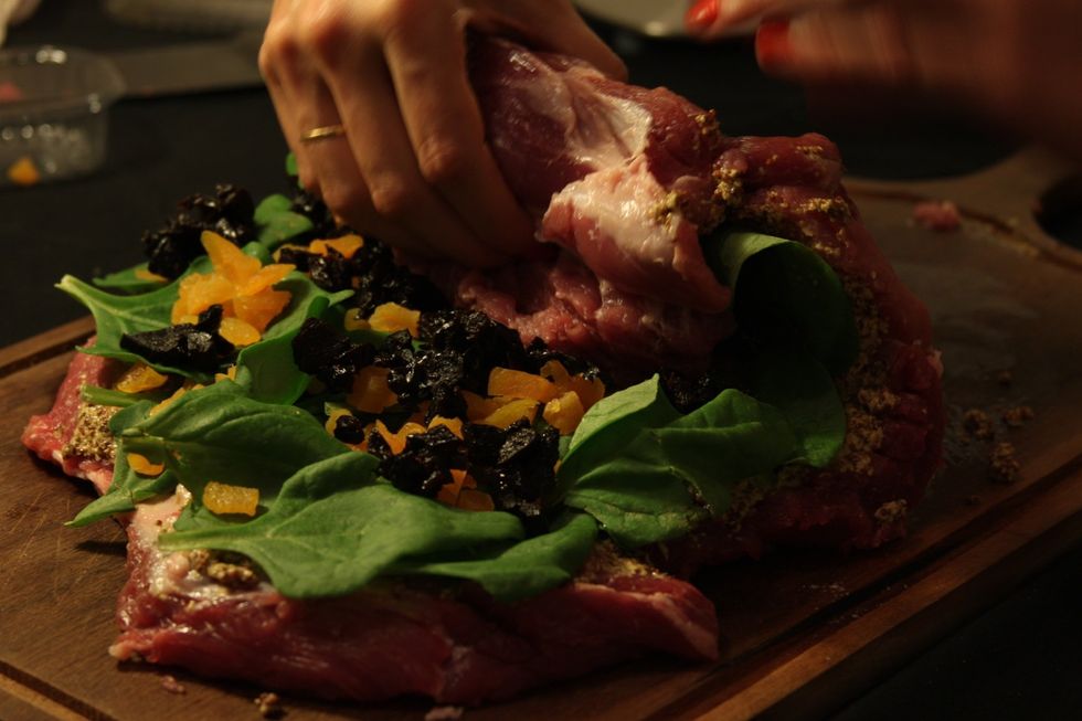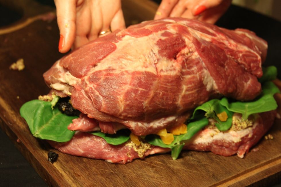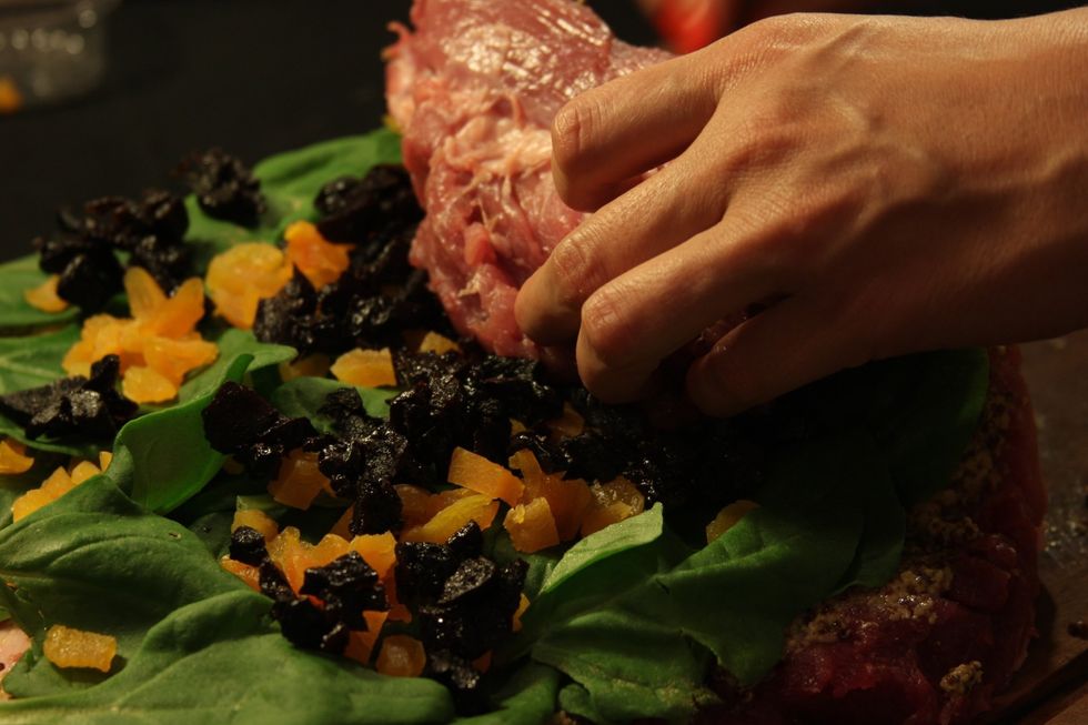 Ingredientes: 1,5kg de porco, 150gr mostarda dijon, 100gr ameixa seca, 100gr damasco turco seco, 1ltr suco de laranja, 20 folhas de espinafre, sal, papel de aluminio, barbante ou palitinhos.