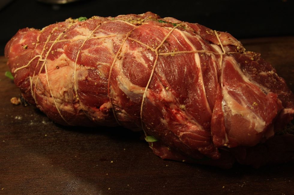 Começe a enrolar o porco com o barbante até ficar completamente amarrado.