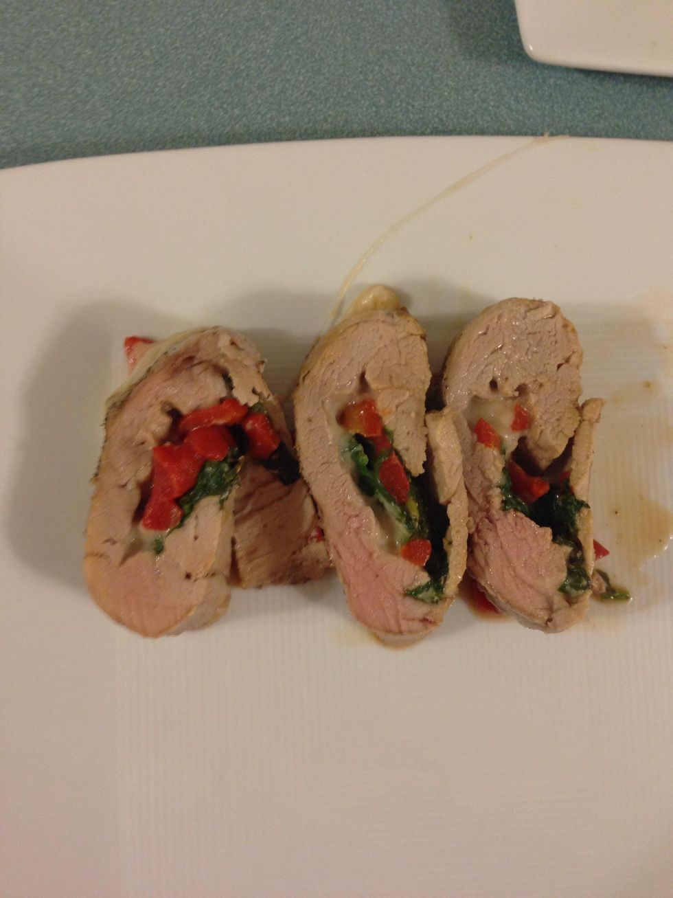Pork loin stuffed with spinach, mozzarella and roasted peppers.