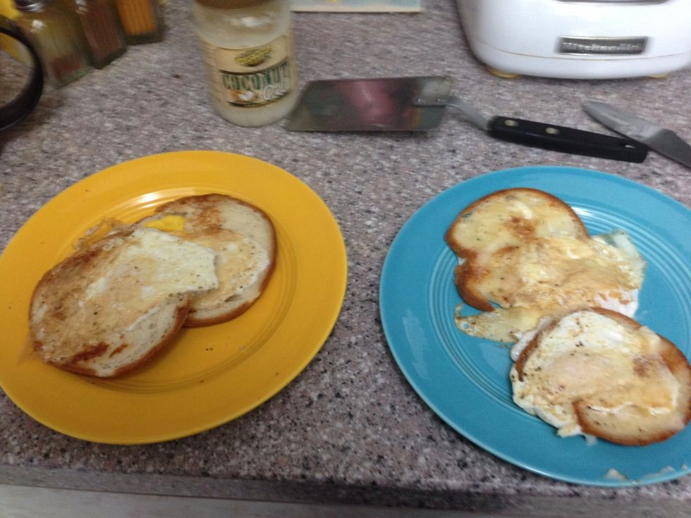 After grilling one side of bagel, flip them and then crack an egg in the hole .