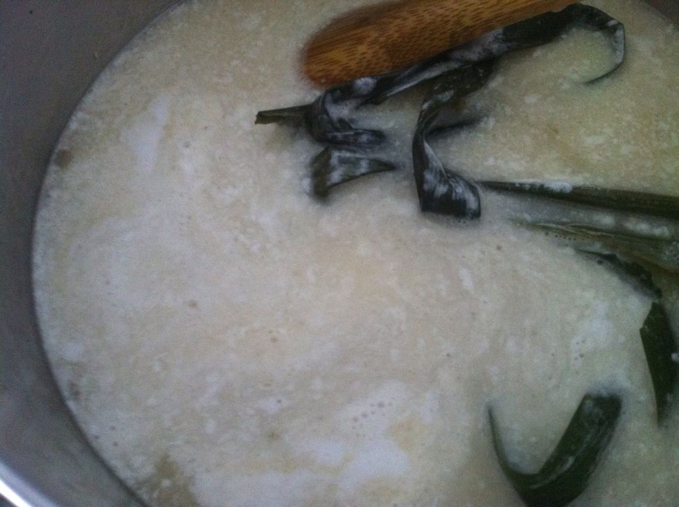 Now that the sago is translucent, it's almost done. Remove the pandanus leaves.
