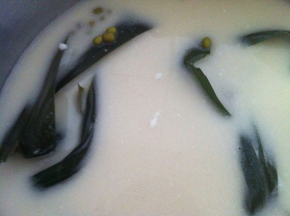 Wash the mung beans with water. Drain well. Add 3 cups water and drained beans into a pot. Tie a knot on the pandan leave & add to the pot