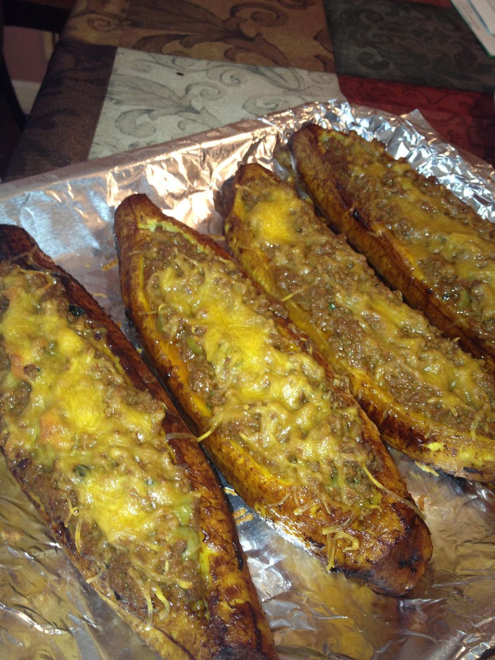 A yummy stuffed sweet plantain that is both sweet and savory. These are called canoas de platanos maduros in Spanish. I hope you enjoy.
