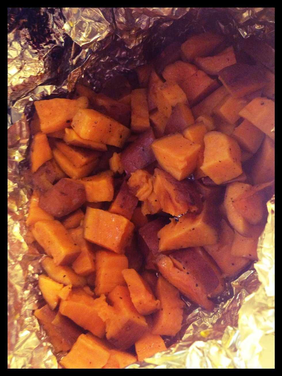 Wash & Dice your sweet potato. Use as many as you think you need. I usually go by one per person, but sometimes they are huge so use your judgement. Cut them the size you prefer, I like them small.