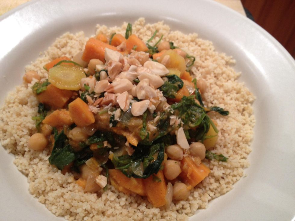 Spread some of the whole wheat couscous in a dish. Top with the stew, and a couple tablespoons of the almonds. Enjoy!