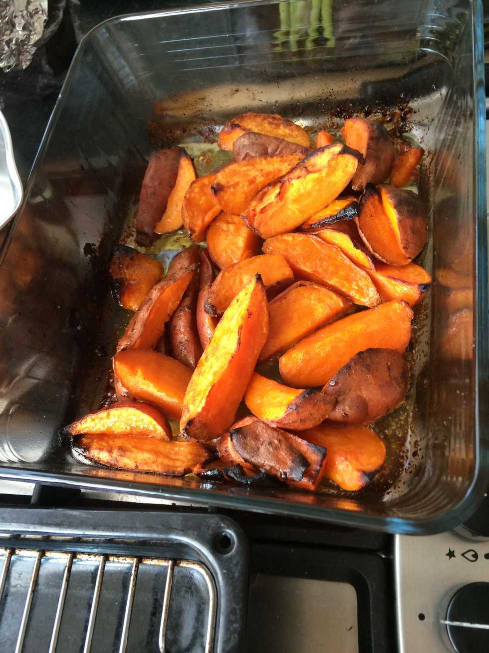 Scrub them Get rid of roots and stuff Roots! Chop them how you like Put them in a glass dish Add oil, vinegar, honey, salt and pepper Toss Yummy!! Bake at about 180 degrees C for half an hour to an hour Tasty!!